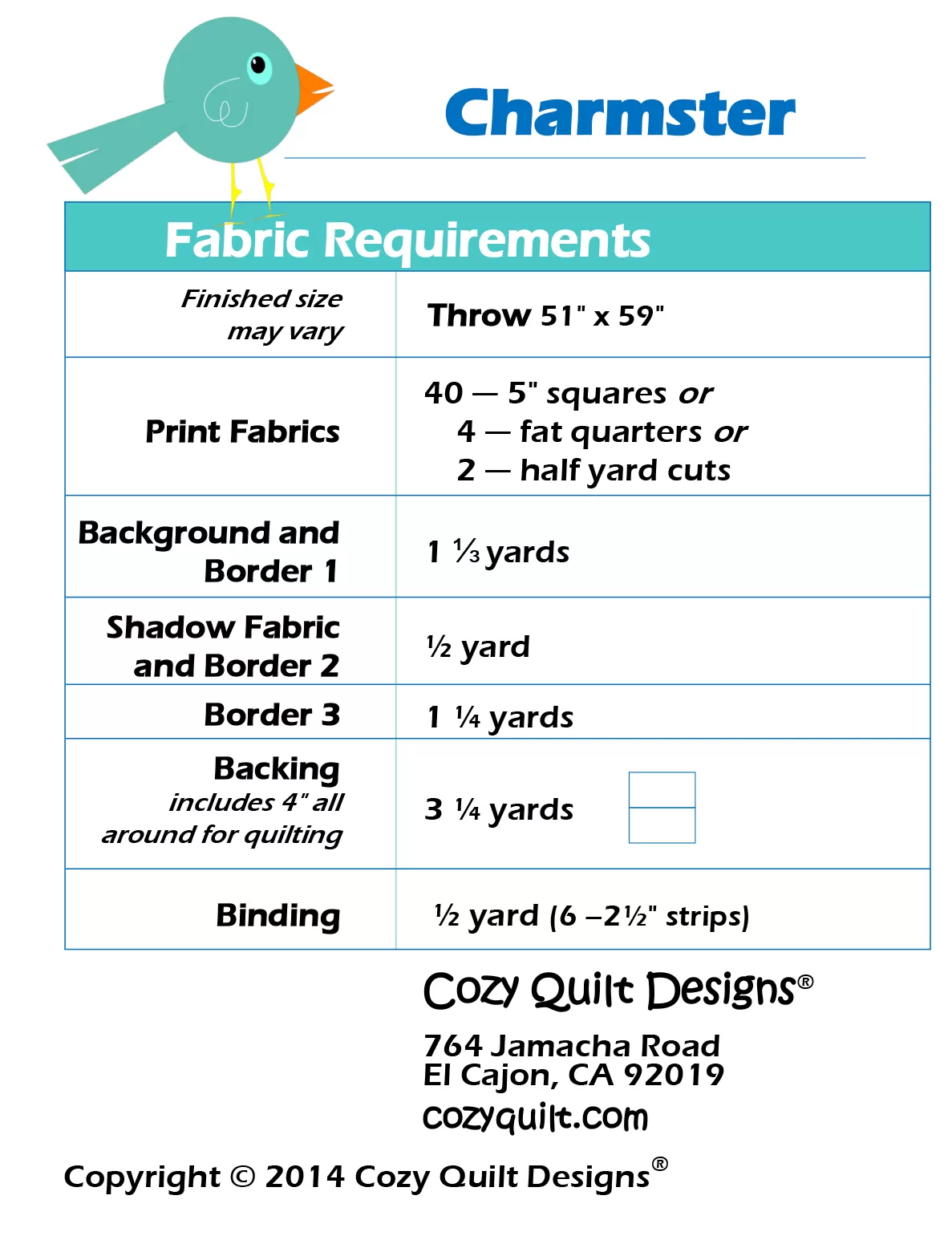Charmster is another fresh quilt in Cozy Quilt Design’s latest line of patterns called Sew Chicks! This quick and simple starts with your favorite 5" Charm Squares and creates a modern look.