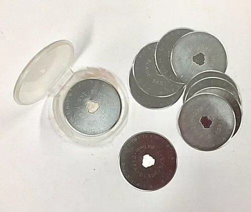 Set of 10 pcs 45mm rotary blades for most popular rotary cutters - Dafa, EMERY, Olfa, Clover, Kai, Eastman, Sew Mate etc. packed in a plastic container as shown.