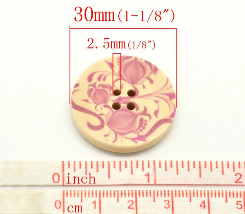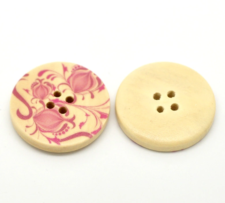 Round wooden Natural Timber Button with Pink Flowers.