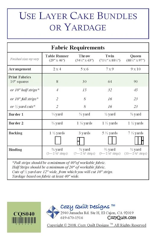 This pattern starts with a variety of 10in squares. It is a great way to use Layer Cakes! It takes nothing but Layer Cakes to make this quilt top (oh, and some borders.) Just as fun as the little pastry treats, this quilt is fast and a delight to look at!