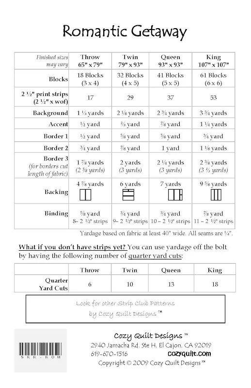 Perfect for soft shades, bold batiks, or anything in between, this quilt is as romantic as the name. Start with 2.5in strips, add background and accent fabrics, and you are on your way to your own fabric getaway. Perfect for Jelly Rolls, Bali Pops and Roll Ups.