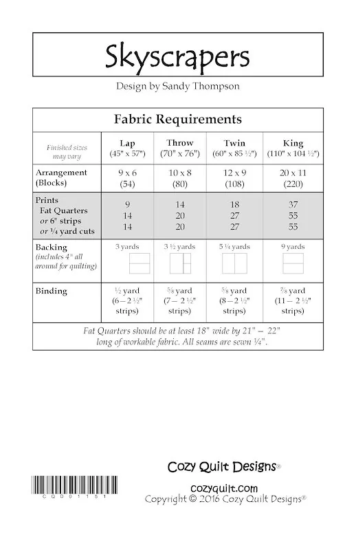 Skyscrapers is a pattern perfect for Fat Quarters, 6in strips, or quarter-yard cuts! It's fast, simple, and gives you room to play with colors and fabrics of your own!