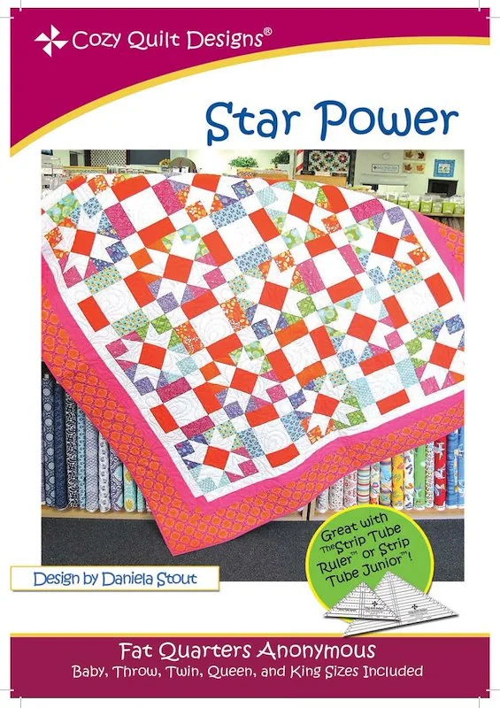 Turn your fat quarters into Star Power with this wonderfully intricate pattern that is actually easy to make. With two interlocking 10in blocks, the pattern comes to life quickly by using the tube technique. A little accent and background helps the pattern take shape and adds that A-list look to your quilt! Great (but not mandatory) gadgets for this pattern are the Strip Tube Ruler and the Strip Tube Junior by Cozy Quilt Designs.