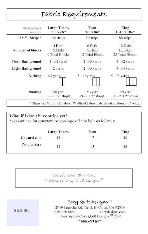 Stars are always a favorite and this is our favorite Star Quilt. The pictured quilt is the Throw and it is made with 40 strips... perfect for VicText Rainbows! Picking Fabrics: Use coordinated fabrics from a line or scrappy fabrics from your stash. There are two background fabrics which give the quilt dimension!
