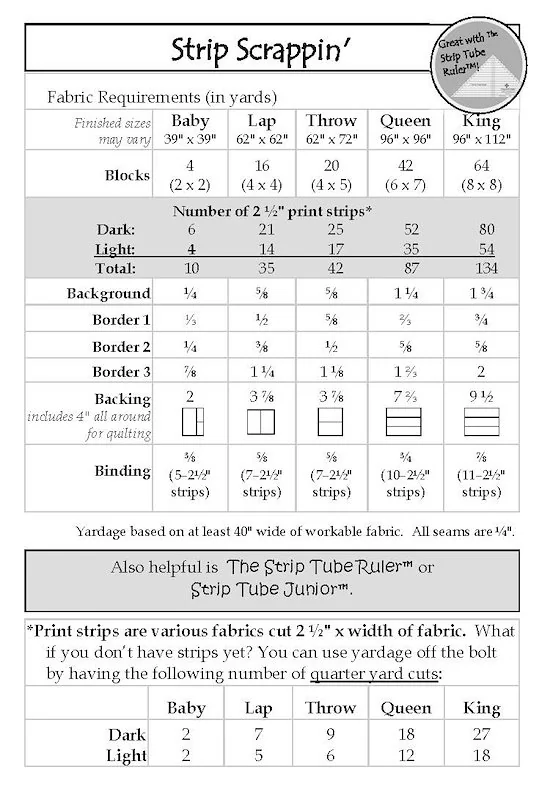 This scrap busting pattern is your fabrics stash's best friend (and your husbands!). This pattern puts those abundant scraps to good use! The blocks are made even easier with our Strip Tube Rulers. You can use either the original The Strip Tube Ruler or the smaller and more convenient The Strip Tube Junior with this pattern.