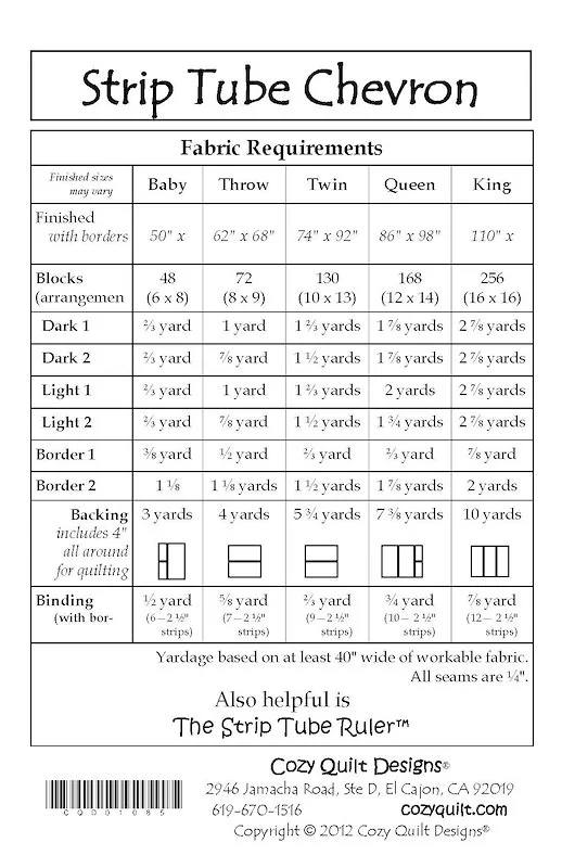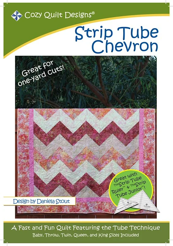 Four fabrics, a couple of borders plus the amazing Strip Tube Technique and you, too can have this fabulous and fashionable chevron quilt. It's so nice and easy, you might just get addicted! The throw size is particularly fun because you can collect four different one yard cuts and borders... easy to buy... easy to make. This great pattern is made even easier with Cozy's Strip Tube Ruler!