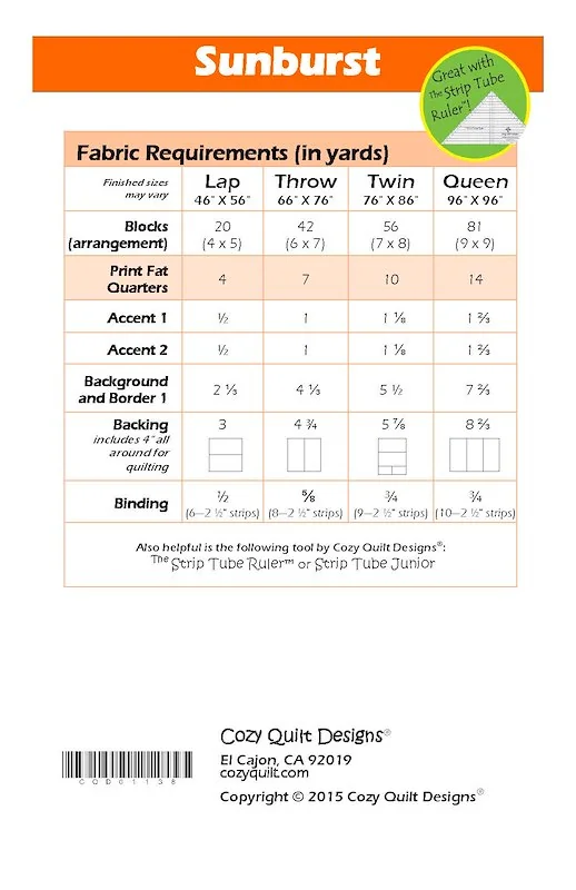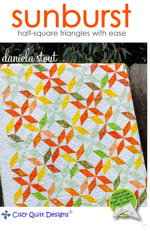 Now introducing Sunburst! The first in a series of new patterns from Cozy Quilt Designs using half square triangles. This pattern features Daniela's latest fabric line with Timeless Treasures: Sunburst, and boy does it show off those bright, fruity colors. Also check out the Fabric bundle by Cozy Quilt Designs. Great (but not mandatory) gadgets for this pattern are the Strip Tube Ruler and the Strip Tube Junior by Cozy Quilt Designs.